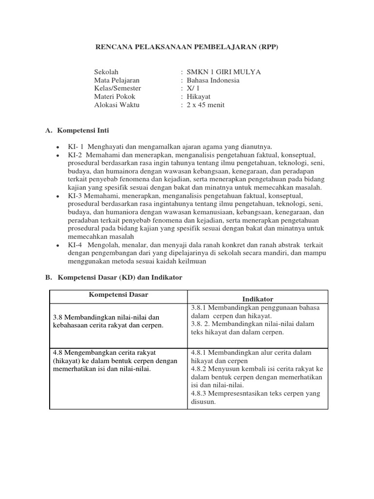 Rpp B Indo Kelas 10 3 8 Dan 4 8 Teks Hikayat